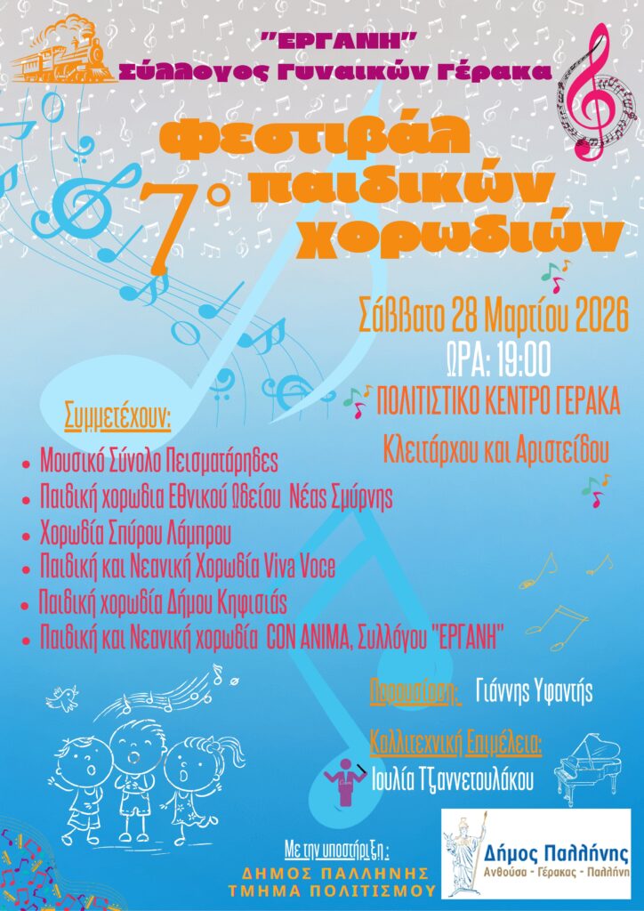 Με μεγάλη χαρά σας ανακοινώνουμε ότι η Παιδική Χορωδία μας συμμετέχει στο έβδομο Φεστιβάλ παιδικών χορωδιών που διοργανώνει ο Σύλλογος Γυναικών Γέρακα “Εργάνη” το Σάββατο 28 Μαρτίου στις 19.00 στο Πολιτιστικό Κέντρο Γέρακα. Θα χαρούμε πολύ να σας δούμε! .