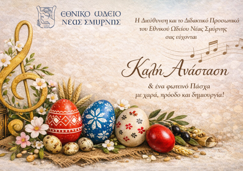 Η Διεύθυνση και το Διδακτικό Προσωπικότου Εθνικού Ωδείου Νέας Σμύρνηςσας απευθύνουν τις πιο εγκάρδιες ευχές τουςγια τις Άγιες Ημέρες του Πάσχα. Καλή Ανάστασηκαι ένα χαρούμενο, φωτεινό και ευλογημένο Πάσχα,με υγεία, αγάπη και καλλιτεχνική δημιουργία. Έναρξη μαθημάτων 20/04 *